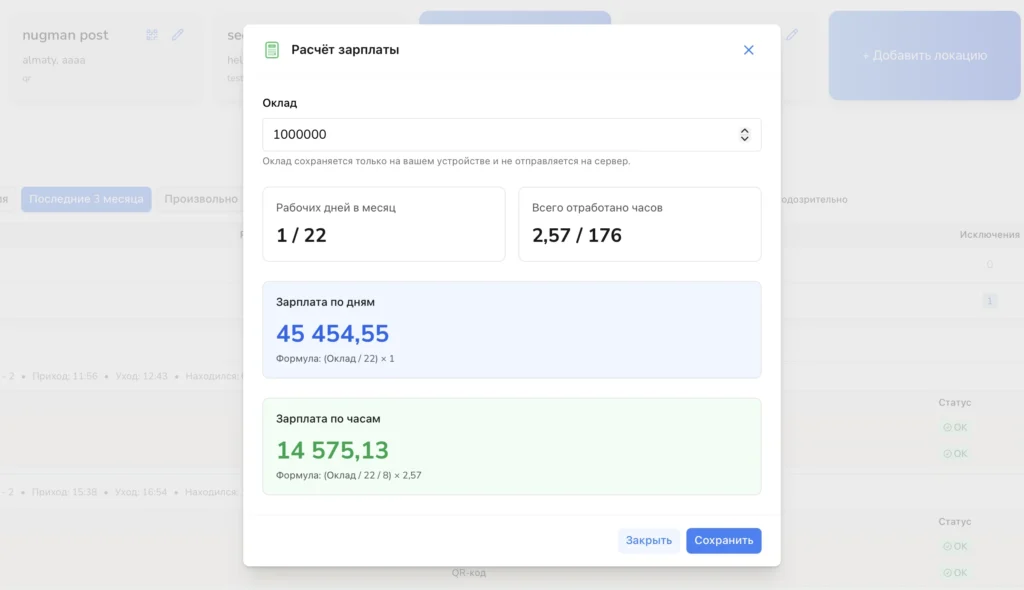 - Данные хранятся онлайн и вы в любой момент можете проверит, когда ваш сотрудник пришел и ушел с работы.